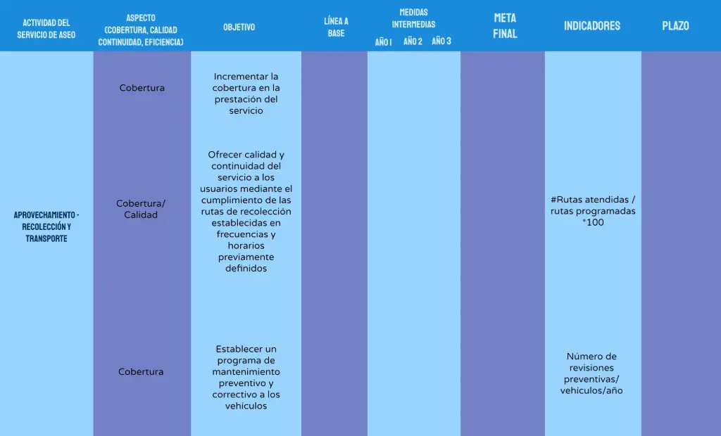 Para la construcción de los objetivos y metas se consideran aquellos aspectos operativos identificando oportunidades de mejora en cada una de las actividades del servicio público de aseo, a continuación se muestran los objetivos y metas trazados: