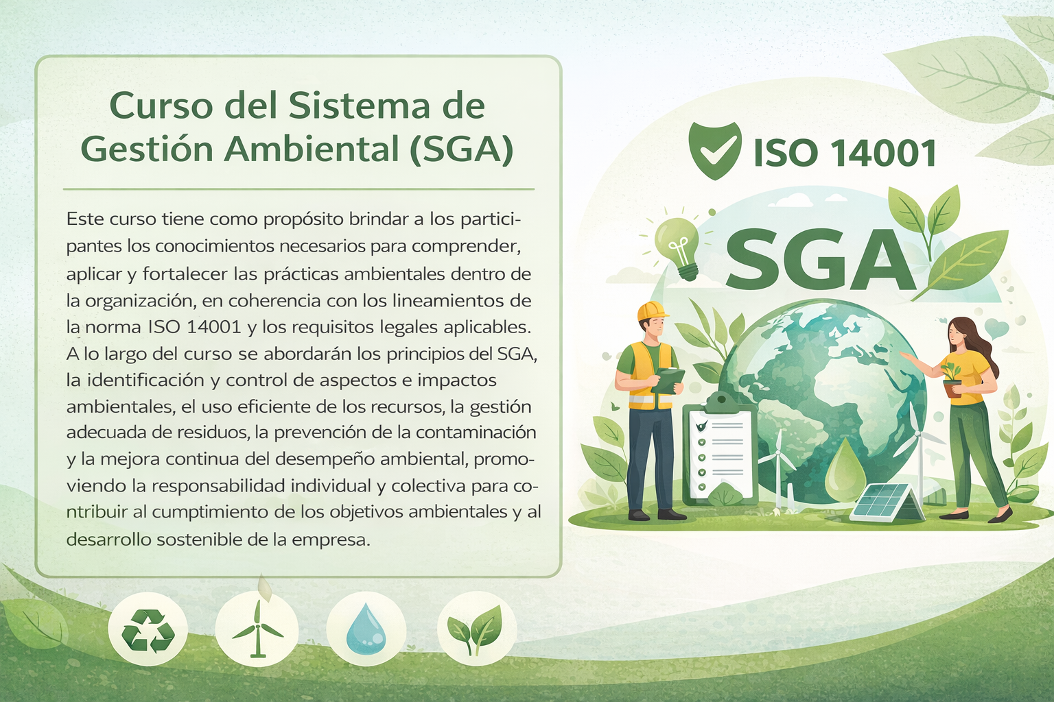Este curso del Sistema de Gestión Ambiental (SGA) tiene como propósito brindar a los participantes los conocimientos necesarios para comprender, aplicar y fortalecer las prácticas ambientales dentro de la organización, en coherencia con los lineamientos de la norma ISO 14001 y los requisitos legales aplicables. A lo largo del curso se abordarán los principios del SGA, la identificación y control de aspectos e impactos ambientales, el uso eficiente de los recursos, la gestión adecuada de residuos, la prevención de la contaminación y la mejora continua del desempeño ambiental, promoviendo la responsabilidad individual y colectiva para contribuir al cumplimiento de los objetivos ambientales y al desarrollo sostenible de la empresa.